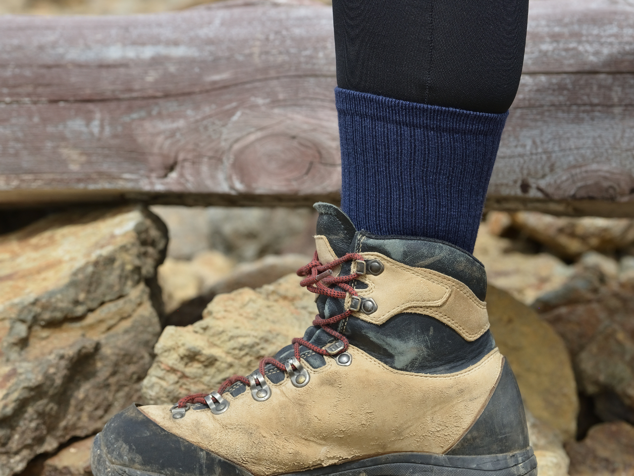 登山でも履ける靴下を目指したので、かかととつま先の肌面部分にパイル地を配置しています。